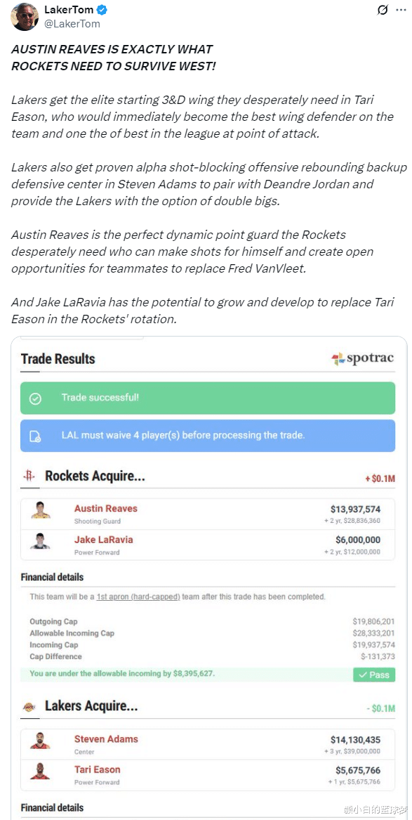 Lake media Laker Tom also suggested a trade between the Rockets and the Lakers. The Rockets' starting point guard VanVleet is out for the season. They will really need a ball-handling core + playmaker like Austin Reeves. What the Lakers happen to need is size and wing defense, so they hit it off. The Lakers sent Reeves, and Laravia got Adams and Ethan. He believes that the deal is a win-win situation.