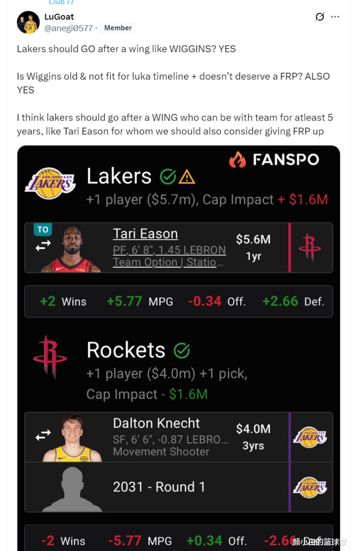 Some Lakers self-media believe that if the team can trade for a top 3D striker like Tali Eason, the team can sacrifice an unprotected first-round pick in the future and use Knect + a 2031 unprotected first-round pick in exchange for Eason. In this way, the Lakers' striker will be more abundant. Eason can continue to assist Doncic after James retires next summer.