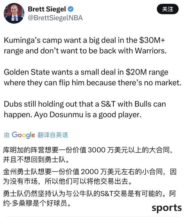 Just this morning, according to an NBA reporter, Kumingga's team insisted on asking for a contract renewal with an average salary of US$30 million