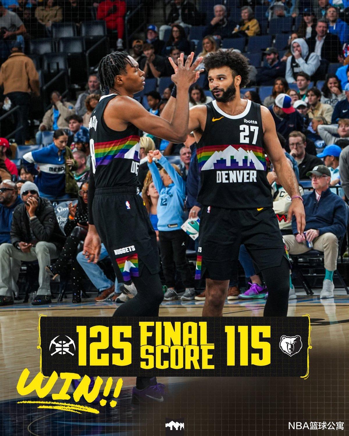 Jokic hit a three-pointer to break the scoring drought for the Nuggets. Wells scored with a high jumper. Jokic assisted Murray with a long shot. Landale scored 2+1, and Murray responded with a three-pointer. Jokic stole the ball, Hardaway Jr. scored a layup, and the Grizzlies requested a timeout. Aldama scored on a throw, Murray and Johnson made mistakes, and Memphis scored on a high jumper. Jokic assisted Watson for a layup, and then assisted Murray for a dunk. With less than 45 seconds left before the end, the Nuggets led by 11 points to seal the victory. Coward hit the ball from the outside, Watson scored a layup, Spencer made a long shot, and the game time ran out. In the end, Denver defeated Memphis 125-115.