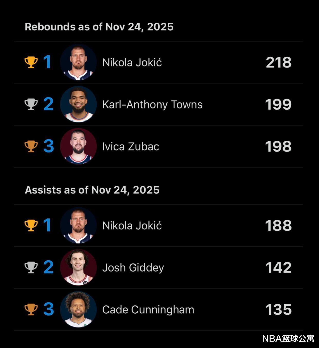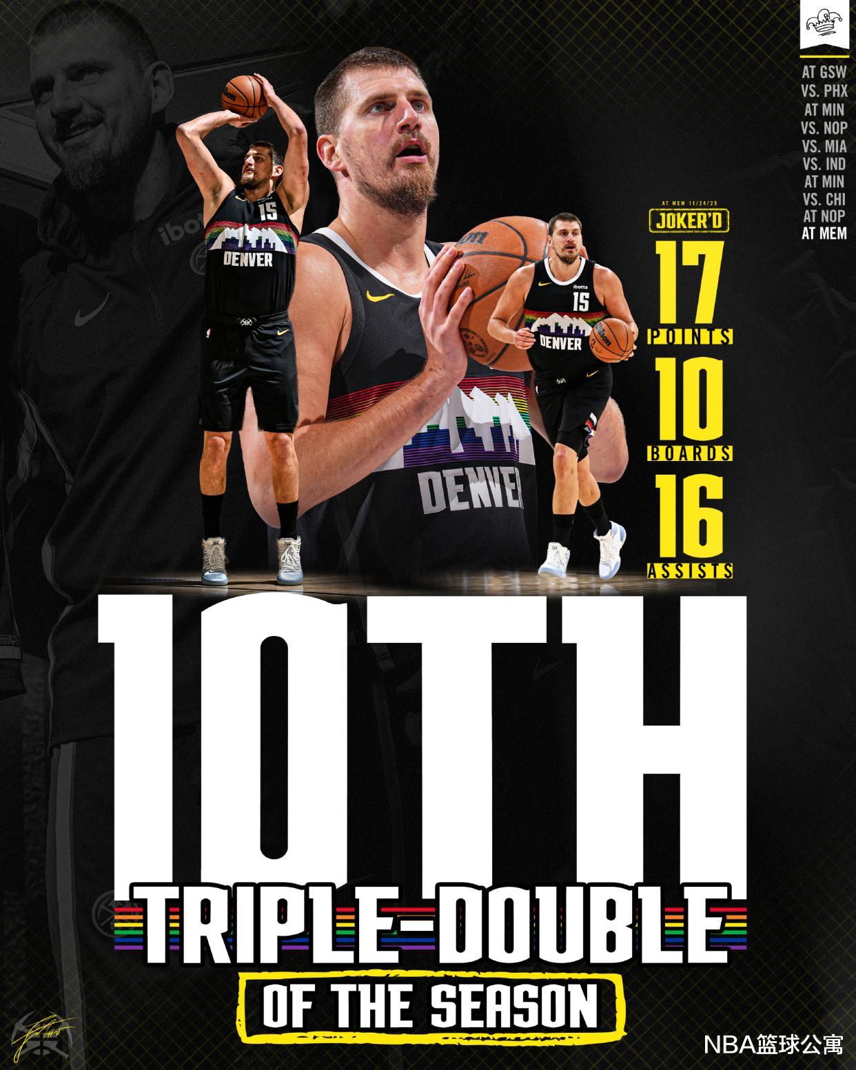 In this campaign, Jokic also set three major NBA miracles. 1. After this battle, Jokic continued to lead the league in total rebounds this season with 218. Second, Jokic ranks first in the league with 188 total assists. Third, this game was Jokic's 10th triple-double this season, continuing to lead the league.