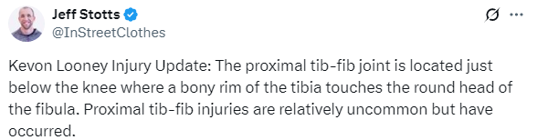However, before the start of the new season, Looney, known as the "Iron Man", was accidentally injured and suffered a sprain of the proximal tibiofibular ligament of his left knee. He was sidelined for at least 2-3 weeks. Since there are still 6 days until the start of the new season, this means that Looney will miss at least the first two weeks of the new season.