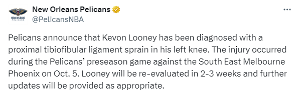 On October 16, the Pelicans suffered another injury. The team's new aid Looney was determined to be injured for at least 2-3 weeks. The New Orleans Pelicans officially announced that Kevin Looney was diagnosed with a sprain of the proximal tibiofibular ligament in his left knee. The injury occurred in the Pelicans' preseason game against the Southeast Melbourne Phoenix on October 6. Looney will be re-evaluated in 2-3 weeks and further information will be released in due course.