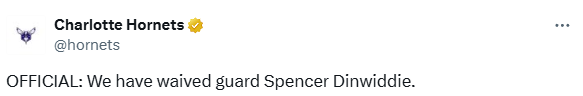 On October 17, 5 days before the start of the new season, 32-year-old Dinwiddie was officially waived. According to ESPN reporter Shams, the Hornets had waived defender Spencer Dinwiddie, and then the Hornets officially announced Dinwiddie.