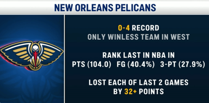 The Pelicans have 0 wins and 4 losses, ranking last in the league in points per game, field goal percentage, and three-point field goal percentage.