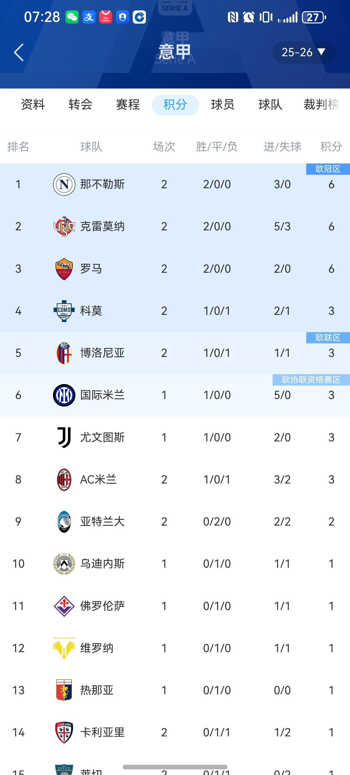 The Serie A League continues to be in full swing! In the second round of confrontation, Napoli won the final victory in the 95th minute, and finally narrowly defeated Cagliari 1-0 to achieve two consecutive victories at the start of the game, reaching the Serie A standings. Roma defeated Pisa 1-0 with the goal in the 55th minute of the game, ushering in a 2-game winning streak + 2 consecutive games of clean sheets. Bologna faced Como at home, and defeated his opponent 1-0 with Orsolini's goal. While ushering in the first victory in the new season of Serie A, it also ended the team's 6-round victory across the season. After the game early this morning, the Serie A standings were officially updated!
