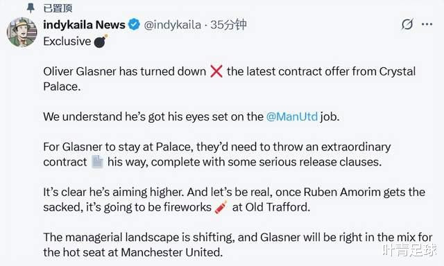In the 2025-26 Premier League season, Crystal Palace is the only team that remains unbeaten, with 3 wins and 3 draws in 6 games, ranking third. Crystal Palace coach Glasner showed excellent coaching skills. On October 2, the famous information account indy kaila (fans called Cuckold) revealed exclusively that Glasner refused Crystal Palace's contract extension and he was waiting for Manchester United to call.