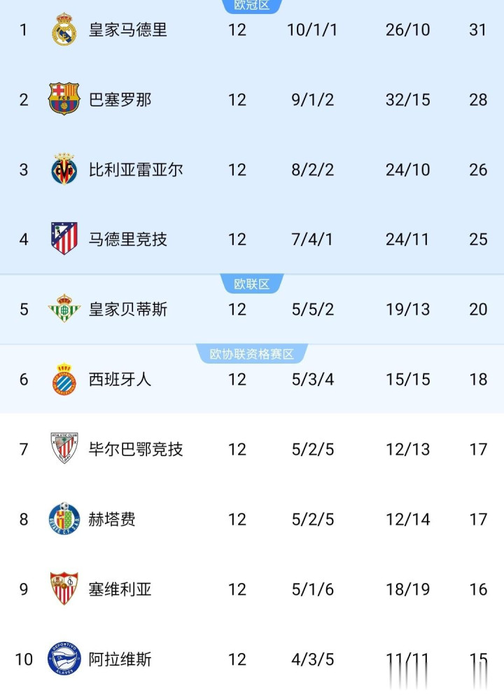 The latest La Liga standings are as follows