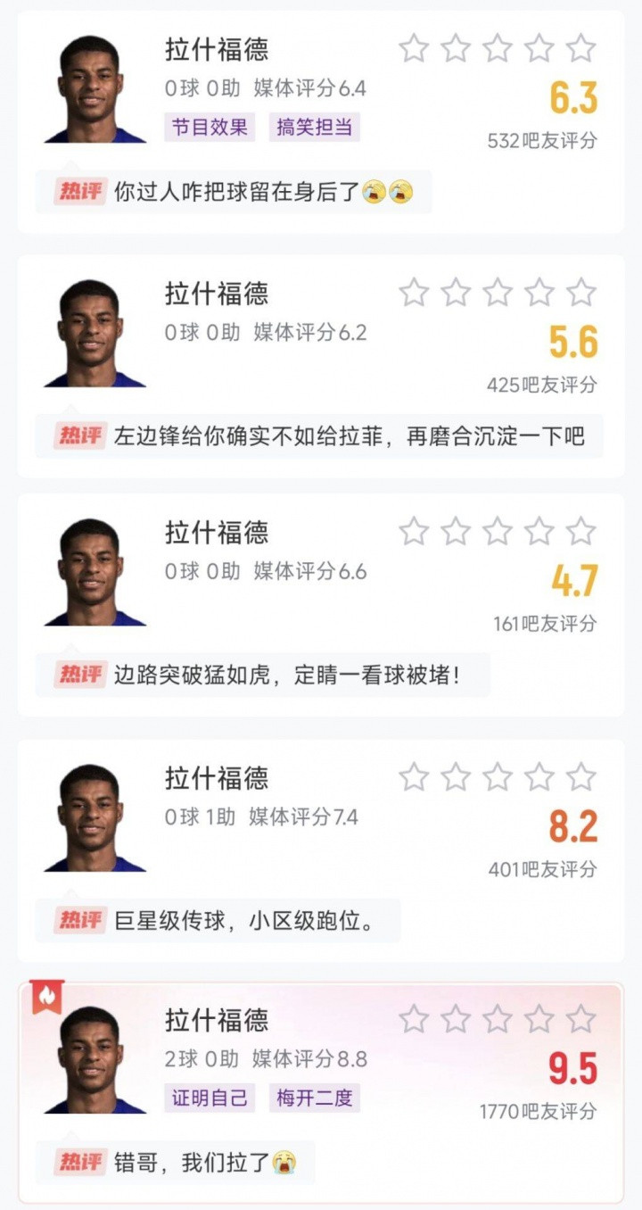 Rashford scored 5 games, from top to bottom, La Liga 1-4 and Champions League first round respectively, in this Champions League match, Rashford started for 81 minutes, 6 shots and 2 shots and scored 2 goals, sent 2 key passes, and also 3 clearances and 2 steals. The England international is worth 50 million euros.