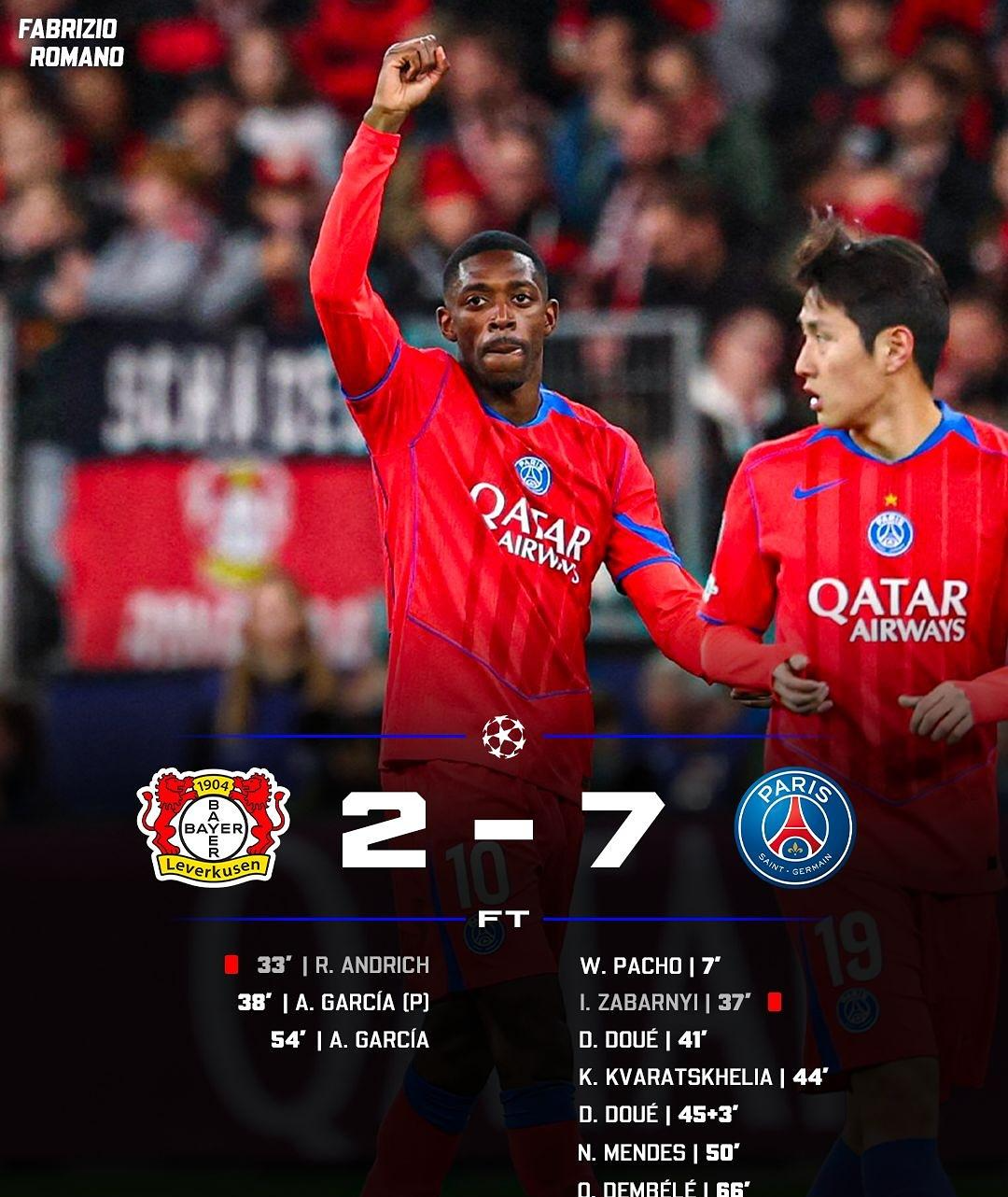 FootballIn the third round of the UEFA Champions League, Paris Saint-Germain set off a scoring storm at the Bayer Arena! In a 7-2 away win over Bayer Leverkusen, Douai scored twice, and Pacho, Kvaratschelia, Mendes, Dembélé and Vitinha all fired five arrows...