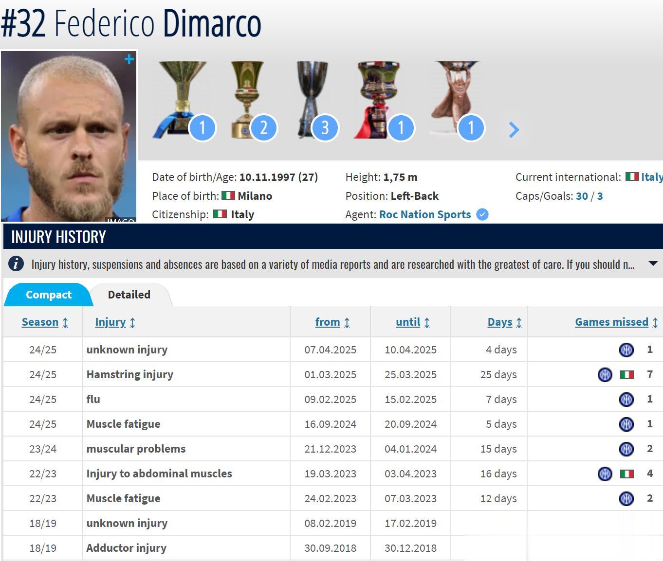 The data shortage of these 17 games refers to the beginning of April 6, 2025 (Inter Milan's home game against Bayern). Until the Club World Cup Inter Milan vs. Fruminense, Dimarco had no goals or assists in 15 club games (Serie A 6, Champions League 4, Italian Cup 1, Club World Cup 4) and 2 national team games.