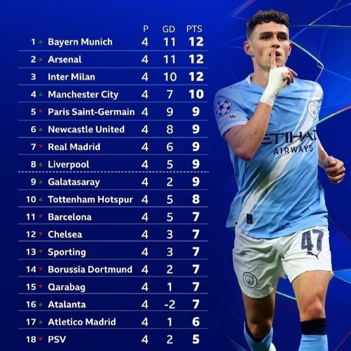 At present, 4 rounds of the Champions League have ended, and 5 of the 6 Premier League teams are among the top 10 in the Champions League standings. Among them, Arsenal ranks second with 4 consecutive wins, Manchester City ranks 4th, Newcastle is 6th, and Liverpool is 8th. All four teams are currently in the direct knockout range.
