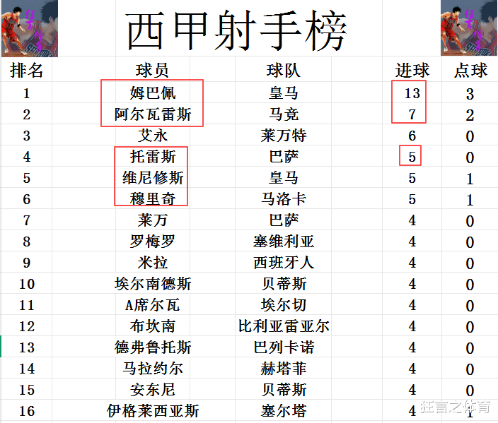 In terms of the scorer list, Mbappe is in full swing, topping the list with 13 goals. Alvarez ranks second behind Mbappe with 6 goals, and Ayon ranks third with 6 goals. Torres scored a goal today, catching up with Vinicius and Muric, and the three of them tied for fourth with 5 goals. Lewandowski, Anthony, Malayor, A. Silva and others just squeezed into the top ten with 4 goals.