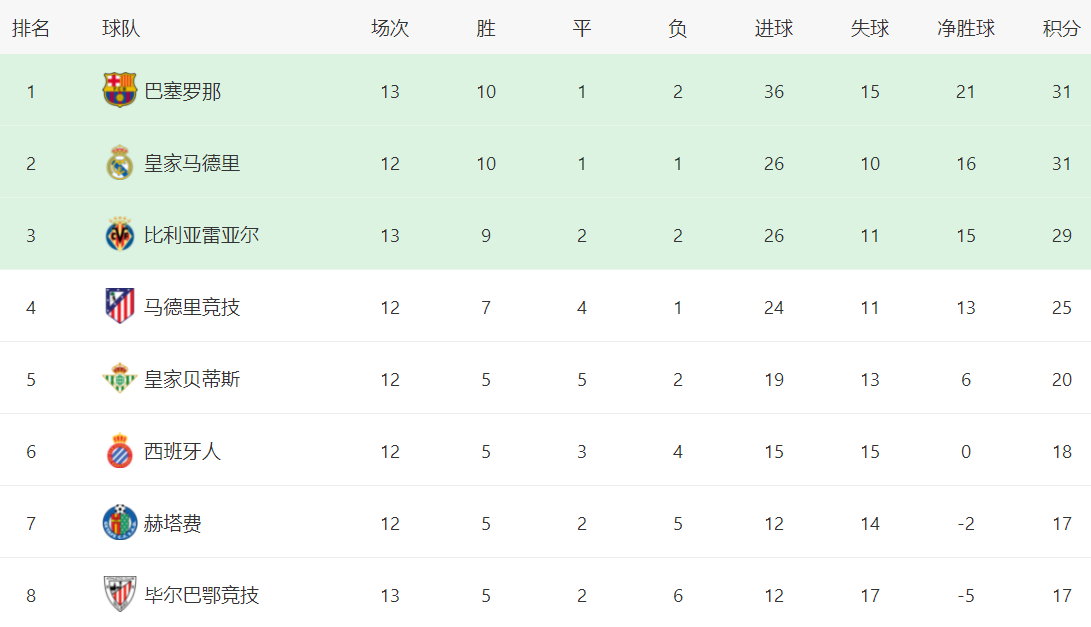 In the standings, Barcelona temporarily surpassed Real Madrid to reach the top. Barcelona has 10 wins, 1 draw and 2 losses, scoring 31 points. Real Madrid also has 31 points, but their goal difference is less than Barcelona, so they can only rank second. However, Real Madrid has played one less game than Barcelona and will have a chance to regain the top spot. Villarreal ranks third with 29 points, and the gap with Barcelona and Real Madrid is very small. Atletico Madrid ranks 4th with 25 points. The fifth place is Real Betis, with 20 points. The Spaniard ranks 6th with 18 points. Getafe and Athletic Bilbao both have 17 points. Sevilla and Real Sociedad only scored 16 points.