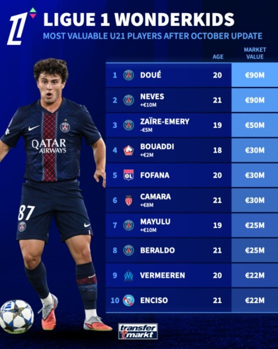 On October 11, the German transfer market updated the latest value of Ligue 1 players. Among U21 players, Douai and Joao Neves tied for the top spot with 90 million euros. Five of the top 10 players are from Paris Saint-Germain.