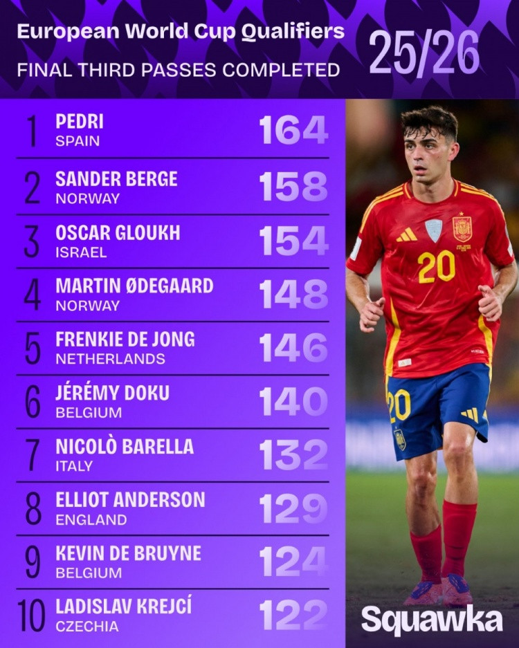 October 15th Squawka listed the ranking of successful passes in the offensive third zone of the European World Cup preliminaries, with Spanish midfielder Pedri ranking first.