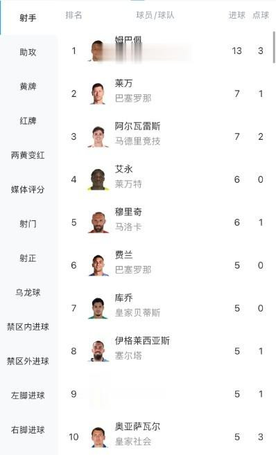 FootballNovember 10 After the 12th round of La Liga, in terms of player data, Mbappe leads the scorer list with 13 goals, and Rashford is tied for the top spot in the assists list. In terms of the scorer list, Mbappe ranked first with 13 goals, Lewandowski...