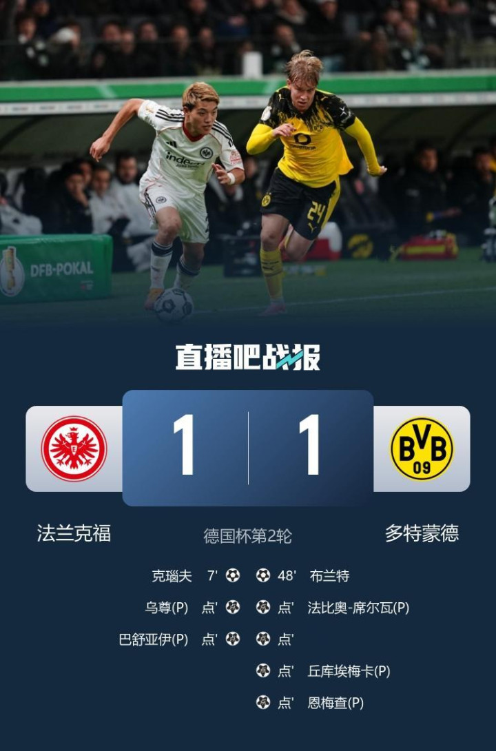 German Cup - Frankfurt advanced to the third round with multiple penalty kicks 5-3. Brandt scored and Anlu missed a point.