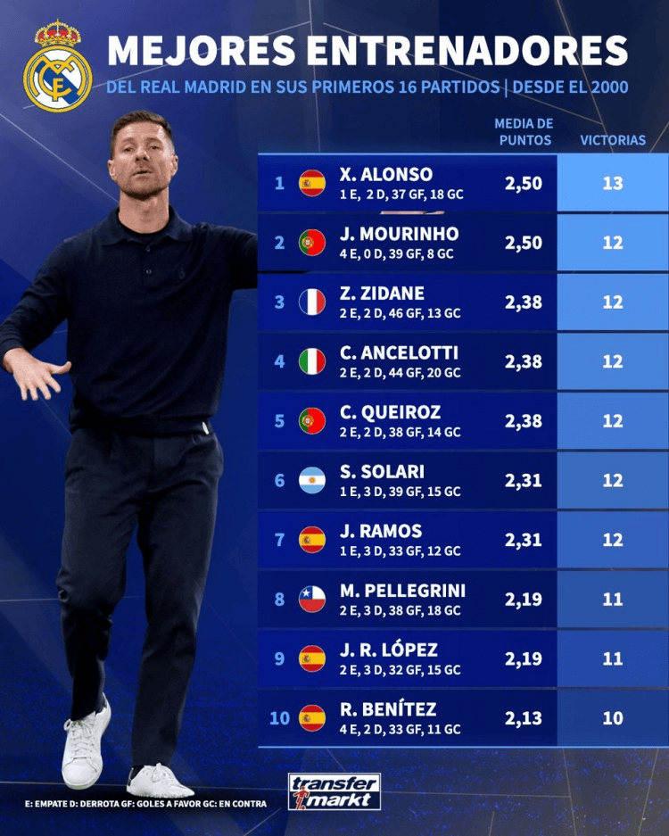 Hupu News on October 10 According to statistics from the German transfer market website, since 2000, the performance of Real Madrid's previous coaches in the first 16 games of coaching ranked among them. This season, new coach Alonso ranks first with an average of 2.50 points per game and 13 wins, becoming the coach with the best start to coach Real Madrid since the 21st century.