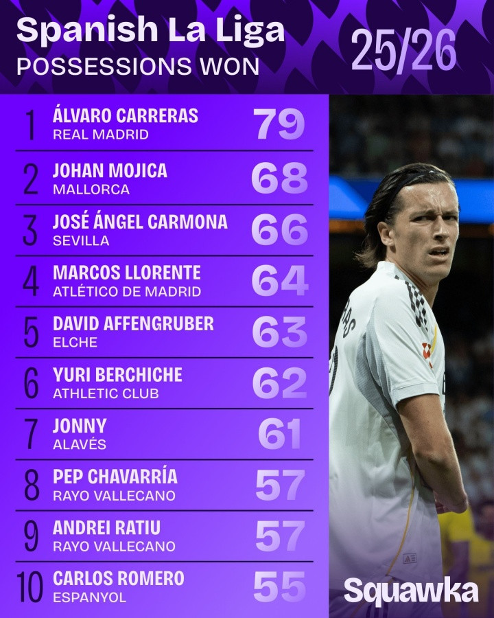 FootballNovember 12th On the court, Real Madrid defender Alvaro Carreras is known for his tough style and hard work. According to Squawka statistics, Carreras is the player who has regained the ball the most in La Liga this season, reaching 79 times. The fo...