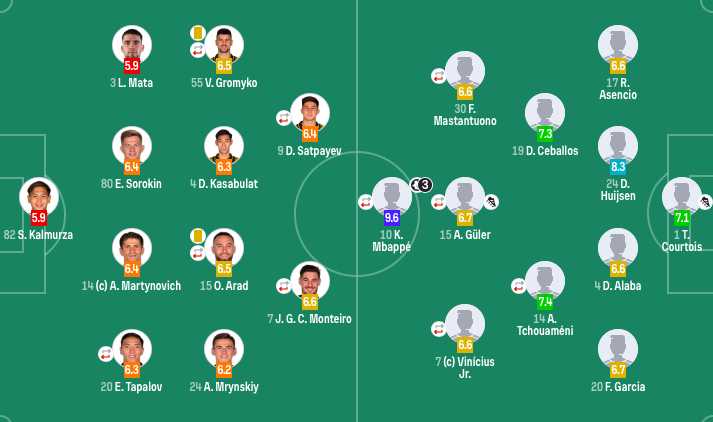 Real Madrid starts: 1-Courtois, 17-Asencio, 24-Herisen, 4-Alaba, 20-Fran Garcia, 14-Chuaméni (80 '6-Camavenga), 19-Seva Los, 15 Guillail (80 '5-Berlingham, 30-Mastantono (70 '21-Dias), 7-Vinitius (70 '11-Rodrigo), 10-Mbappe (81 '16-Gonzalo Garcia)