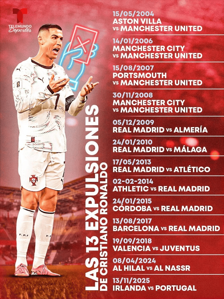 This is the 13th red card the Portuguese has received in his career. The specific games are as follows: