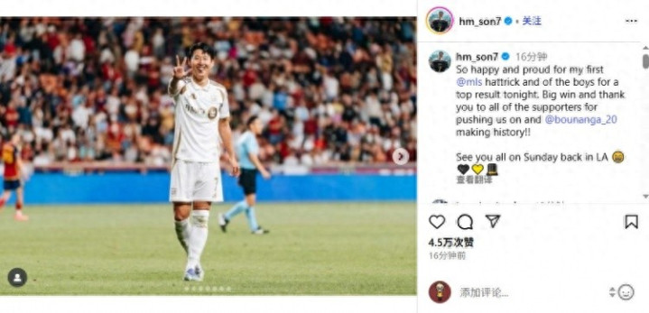 September 18th News Son Heung-min performed his first hat-trick in his MLS career today, helping Los Angeles FC defeat Real Salt Lake City 4-1. After the game, the Korean star posted a picture on Instagram to celebrate.