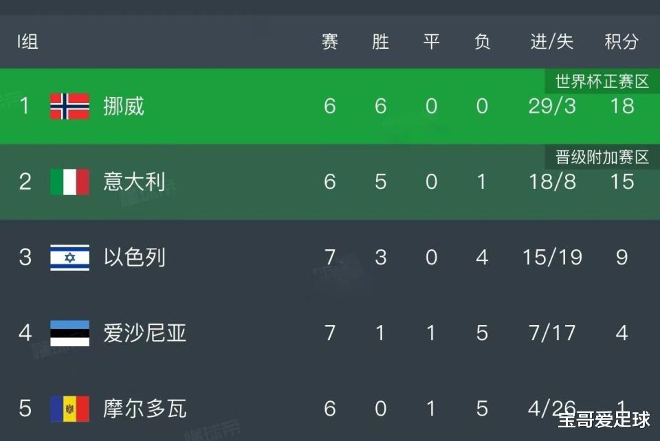 There are 5 teams in Group I of the World Cup European Qualifiers, namely Italy, Norway, Israel, Estonia and Moldova. Since the number of teams is an odd number, one team will have a bye in each round. After 8 rounds of group matches, Norway ranked first in the group with 18 points and 6 wins, scored 29 goals and conceded 3 goals, and had a goal difference of 26. Italy ranked second in the group with 15 points and 5 wins and 1 loss in 6 games, scoring 18 goals and conceding 8 goals, with a goal difference of only 10. The only loss was a 0-3 away defeat to Norway in the third round; Israel ranked third in the group with 9 points from 7 games, 3 wins and 3 losses, Estonia ranked fourth in the group with 4 points from 7 games, 1 win, 1 draw and 5 losses, and Moldova was at the bottom of the group with 1 point from 6 games, 1 draw and 5 losses.